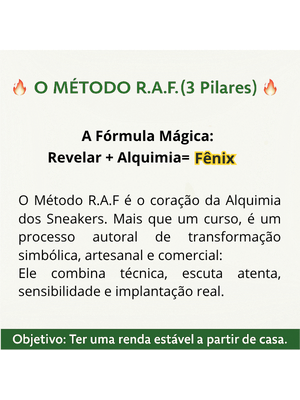 Um curso completo com 21 aulas, 2 módulos bônus e uma aula secreta — guiando você desde o primeiro par até a entrega premium que gera renda e orgulho. Tudo com o Método R.A.F: Revelação + Alquimia = Fênix.
